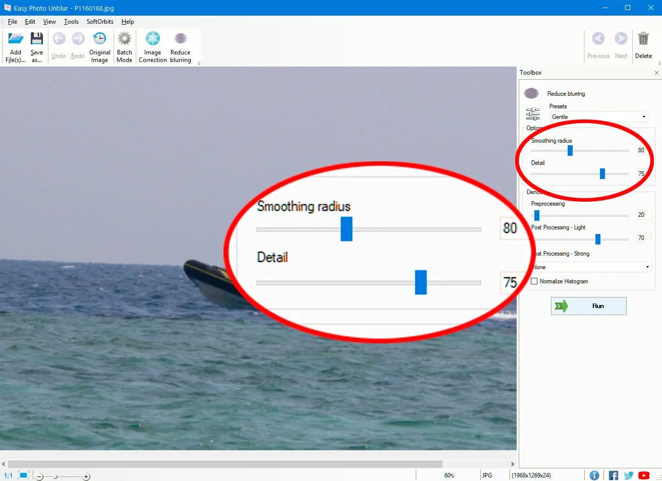 - Narzędzie do usuwania rozmycia z regulowanymi ustawieniami Ilość, Promień, Szczegóły i Maskowanie.